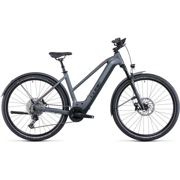 Den Nuride Hybrid 750 Allroad gibt es als Tiefeinsteiger, Trapezrahmen oder klassischen Herrenrahmen und jeweils in verschiedenen Größen, was bedeutet, dass jeder Entdecker die perfekte Passform für sich findet. Im Zentrum dieser brandneuen Konstruktion sitzt – sauber und unauffällig ins Design integriert – der 750 Wh starke Akku für maximale Reichweite. Außerdem hat Cube zwei Ideen von ihren Mountainbikes aufgegriffen. Zum einen wurden die Schalt- und Bremszüge ins Innere verlegt, was den Wartungaufwand minimiert, zum anderen garantiert ein X12 Boost Hinterbau sicheres, zuverlässiges Handling. Fazit: alles, was man braucht, in einem clean designten Paket! In puncto Sicherheit und Bremskraft (selbst bei Nässe) liefern die kraftvollen hydraulischen Shimano Scheibenbremsen mit 4-Kolben Konstruktion zuverlässige Dienste. Und weil Cube das Bike mit viel praktischem Zubehör ausgerüstet haben, ist es zu jeder Zeit für alles bereit. Auf ins Abenteuer!